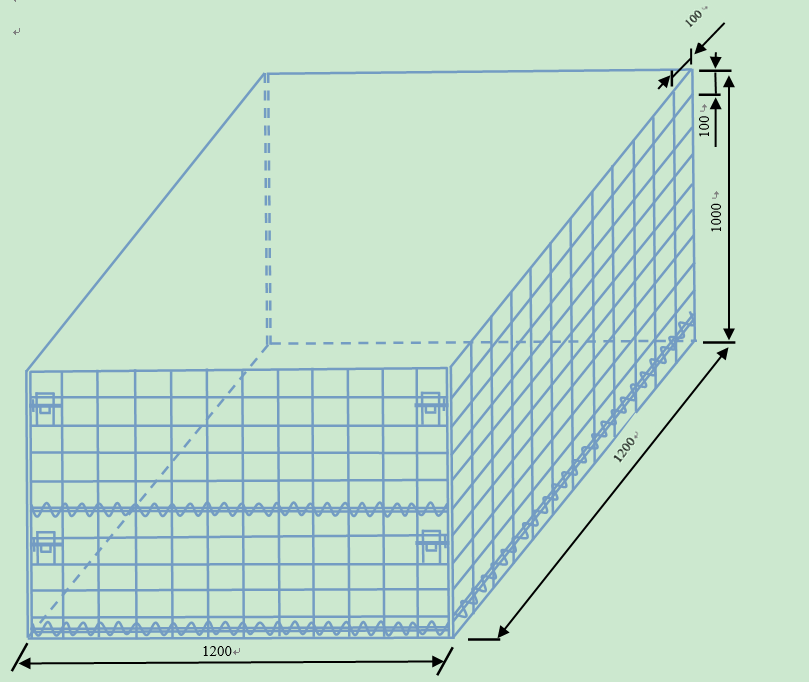 2.3.1.4尺寸要求:外形尺寸规格为(长X宽X高)1200mmX1200mmX1000mm,长和宽尺寸偏差≤2mm。有底无盖,网目100mmX100mm,线径φ6mm。