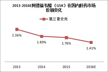 阿德福韦酯用于治疗有乙型肝炎病毒活动复制证据,并伴有血清氨基酸转移酶(ALT或AST)持续升高或肝脏组织学活动性病变的肝功能代偿的成年慢性乙型肝炎患者,不宜用于儿童和青少年。2015年国内阿德福韦酯市场规模达40亿元,近三年来GSK在18家厂家中排名第二位,正大天晴近三年占据阿德福韦酯市场第一名,但其市场份额也处于下降趋势。