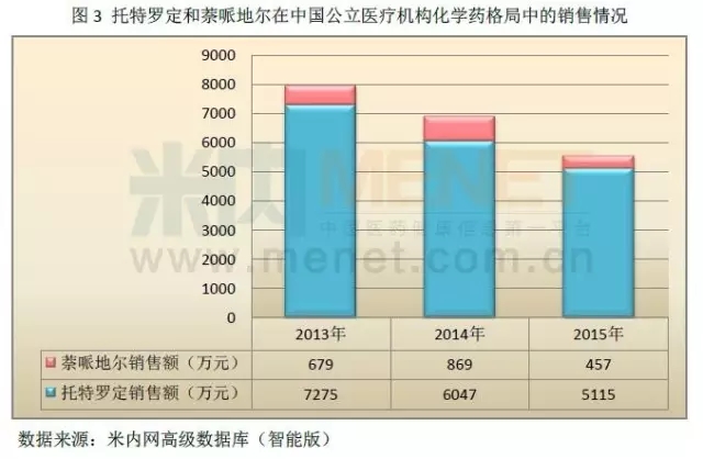 由图3可以看出,托特罗定和萘哌地尔在城市公立医院、县级公立医院、城市社区和乡镇卫生院四个化学药格局中的合计销售情况。