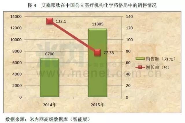 由图4可知,2014-2015年艾塞那肽在城市公立医院、县级公立医院、城市社区和乡镇卫生院四个化学药格局中合计销售额逐年增长,2015年的销售额突破亿元,两年的增长率均保持在75%以上。