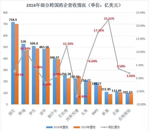 以下是2016年部分跨国药企营收情况:
