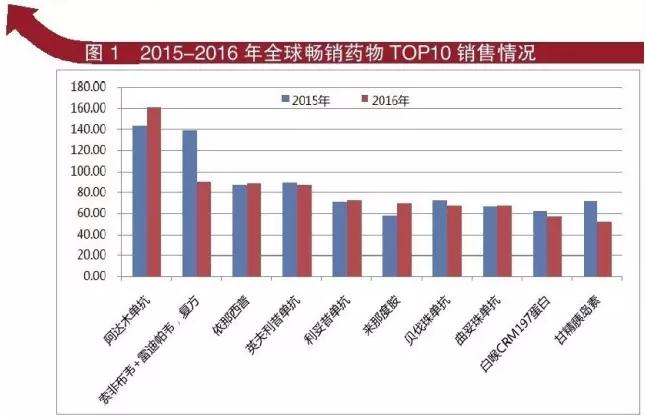 2016年全球畅销药TOP 10分别是:阿达木单抗、复方索非布韦/雷迪帕韦、依那西普、英夫利昔单抗、利妥昔单抗、贝伐珠单抗、来那度胺、曲妥珠单抗、白喉CRM197、甘精胰岛素。