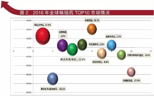 2016年全球畅销药TOP 10最大看点是阿达木单抗和来那度胺两个产品,销售额较同期增长均在10%以上,来那度胺则增长20%以上。“药王”Humira(阿达木单抗)表现堪称惊艳,2016年销售额达到160.78亿美元。Revlimid(来那度胺)销售额接近70亿美元。