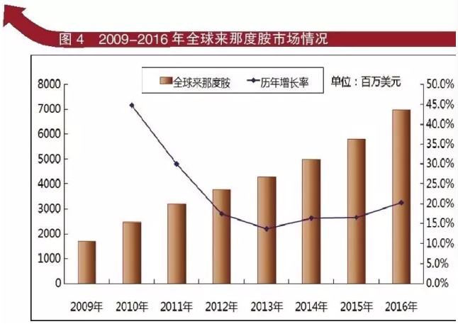 来那度胺是美国新基公司开发的新一代血液病治疗药物。作为后起之秀的新基公司,依靠来那度胺占据美国医药界的一席之地。据新基2016年财报分析,来那度胺凭借强劲增长态势,全年取得净销售收入111.85亿美元,相比2015年同期的91.6亿美元增长20%,已成功进入生物制药公司百亿美元俱乐部。来那度胺2016年销售收入已经达到70亿美元,该药2015年2月被批准为多发性骨髓瘤的一线疗法,而后继上市的药物也多要求与来那度胺联用,这都大大增加了来那度胺的目标患者。来那度胺已成为全球最受关注的重磅产品之一。