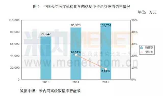 卡泊芬净为抗真菌药物,目前国内仅有原研默克一家产品在售。由图2可以清楚地看出,2013-2015年卡泊芬净在中国城市公立医院、县级公立医院、城市社区和乡镇卫生院四个化学药格局中合计销售额均呈现上涨的趋势,2015年的销售额达到10.47亿元。加上去年10月份获批的达托霉素,恒瑞在高端抗菌药领域产品线日益丰富。2010-2016年,恒瑞仅获批卡培他滨一个首仿品种,此次醋酸卡泊芬净获批,为该公司首仿阵容再添新军。