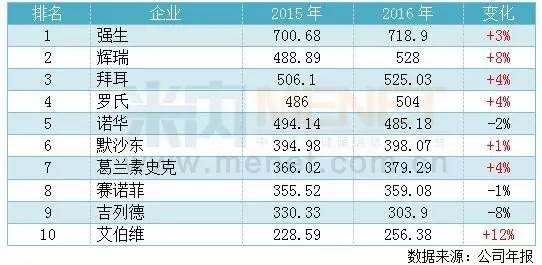 2015-2016年外资药企全球销售总收入排名前十(单位:亿美元)
