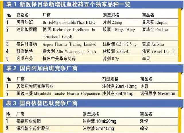 新增的7个抗凝药分别是:直接Xa因子抑制剂阿哌沙班口服常释剂、磺达肝癸钠注射剂、舒洛地特口服常释剂,直接凝血酶抑制剂达比加群酯口服常释剂、阿加曲班注射剂,血小板凝聚抑制剂依替巴肽注射剂、吲哚布芬口服常释剂。其中5个药物是独家品种(见表1),此外,阿加曲班和依替巴肽各有2家企业生产(见表2和表3)。