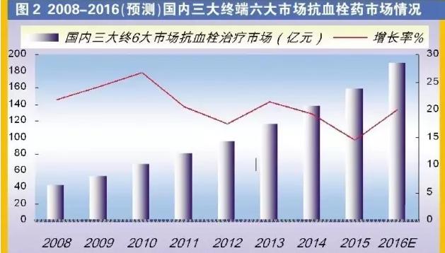 另据米内网“国内城市公立医院、县级公立医院、社区卫生中心、乡镇卫生院、实体药店和网店”三大终端6大市场数据,测算抗血栓药物2016年市场规模近200亿元。