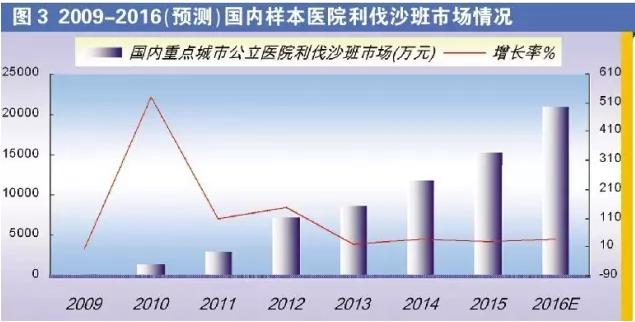 2009年利伐沙班在中国上市,商品名为拜瑞妥。据HDM系统数据,2016年1-3季度,国内重点城市公立医院利伐沙班用药金额为1.57亿元,预测2016全年用药金额为2.10亿元,同比上一年增长了37.85%,增长率较上一年提高了9个百分点,已是抗血栓药物中前5个主力品种之一。