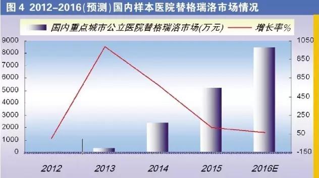 2012年11月,CFDA批准替格瑞洛在中国注册,用于减少急性冠状动脉综合征(ACS)血栓事件发生的口服药物治疗,商品名为倍林达。据不完全统计,替格瑞洛已经在全球85个国家获批上市,被29个国家医疗保险目录收载,将是氯吡格雷的换代品种。据HDM系统数据,2016年1-3季度国内重点城市公立医院替格瑞洛用药金额为6359万元,预计2016年全年用药金额为8479万元,比上一年增长了62.12%。
