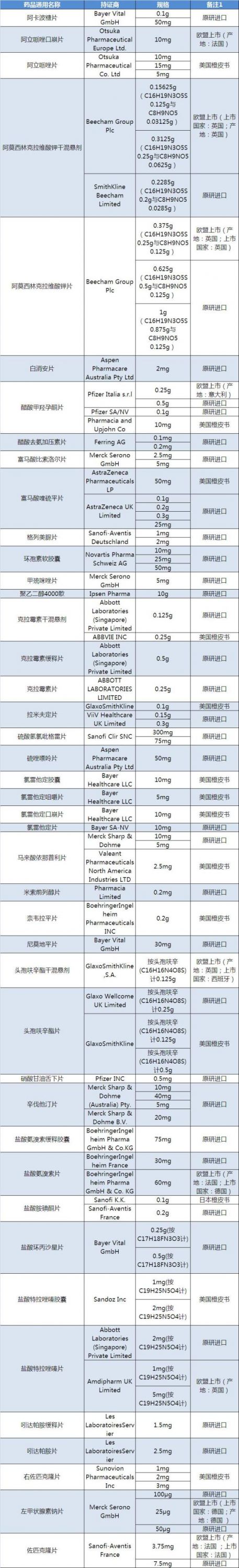 合计共43个品种84个品规被公布。参比制剂来源于美国橙皮书的产品共13个产品,19个品规。原研进口的产品共34个,53个品规。来源日本橙皮书的产品1个,1个品规。其余的都是来自欧盟上市的产品。