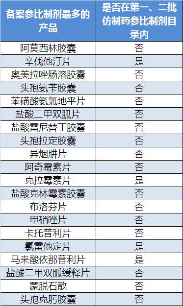 从企业备案的参比制剂情况可以侧面了解各大生产企业对一致性评价项目的偏好。咸达数据V3.2比较企业备案参比制剂最多的20个产品与第一二批仿制药参比制剂目录可得,目前只有4个产品在CFDA所公布的前两批仿制药参比制剂目录内,分别是辛伐他汀片、克拉霉素片、氯雷他定片和马来酸依那普利片。由此可见,即使CFDA有意通过信息分享机制来推动一致性评价,然而所公布的参比制剂未能满足竞争较大产品的需求。