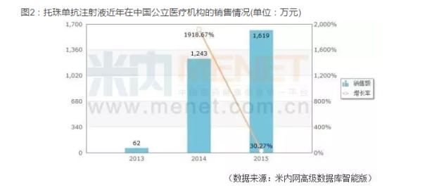 据米内网数据库显示,自2013年上市以来,托珠单抗注射液在我国公立医疗机构(中国城市公立医院、县级公立医院、城市社区中心、乡镇卫生院)的销售稳步增长,2015年达到1619万元。罗氏表示,增加适应症后,托珠单抗注射液作为中国目前唯一获批的治疗全身型幼年特发性关节炎的生物制剂,将迎来15000名患儿需求的市场。
