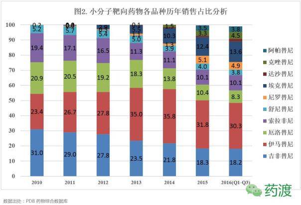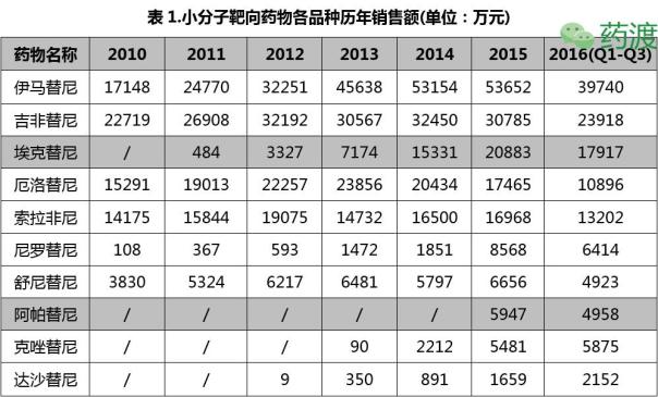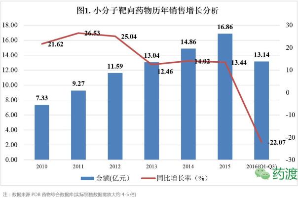 近年来,小分子靶向药物市场也迎来了快速增长期。自2010年以来,重点城市样本医院销售额年增长率均保持在10%以上,2011年全年较2010年增长率达到了26.53%。从2013年开始,增长速度略有放缓,但在整个抗肿瘤药物市场中的所占份额并未下降。2015年样本医院市场已达16.86亿元,放大后的终端市场大约为70-80亿元。