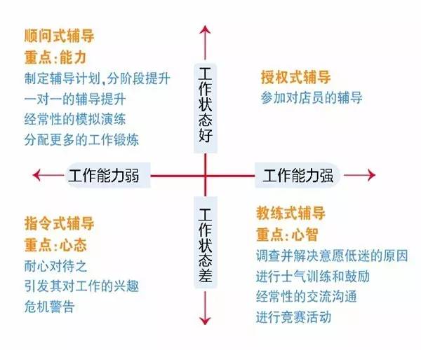 此外,门店工作繁杂、千篇一律,难免会让某些员工觉得枯燥而不能坚持,在门店内容易产生“老 油条”。所以除了在技能上辅导,店长也要注重在心理和态度上对员工的辅导,及时地给员工“加油、打血”,使之保持良好的工作状态,更能将主要精力集中在门店目标的达成之上。
