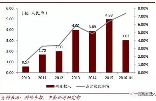 科伦这几年对于研发的投入也是不遗余力,据年报显示,从2013年以来,研发投入已经超过19亿元,而去年的研发投入是6.13亿元,较2015年增长了23.07%,占营业收入的7.16%。(直言)