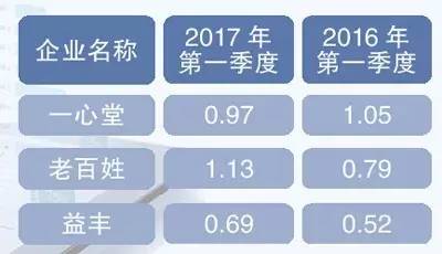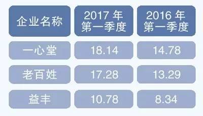 对比2016年一季度的数据,一心堂营收14.78亿元,同比增长23.23%,净利润1.05亿元,同比增长16.76%;老百姓总营收约13.29亿元,同比增长26.86%,净利润约7907万元,同比增长20.49%;益丰营业收入达到8.34亿元,同比大增30.34%,净利润达到5228万元,比上年度同期增长27.11%。