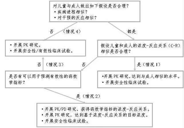 有效性临床试验的流程方面,CFDA借鉴了美国食品药品管理局(FDA)的儿科人群研究设计与外推决策流程图(见图1),根据不同的情况相同或类似机制药物在成人及儿科人群间的人体药代动力学PK、PD试验结果,从成人剂量外推拟用于儿科人群的剂量。