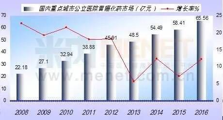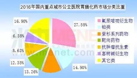 据米内网中国城市公立医院化学药终端监测分析系统(简称HDM系统)数据显示,2016年国内重点城市公立医院抗肿瘤和免疫调节剂用药市场已达239亿元,同比上年增长了10.30%,其中胃癌化疗药物市场为65.56亿元,同比上年增长率为12.24%,占据了重点城市公立医院抗肿瘤和免疫调节剂用药市场的27.43%,林林总总已有20多个化药用于胃癌的治疗。预测国内胃癌化疗总体市场已达到280亿元规模。