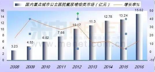 据HDM系统数据显示,2016年国内重点城市公立医院氟尿嘧啶类用药市场已超过了15.02亿元,同比上一年增长了13.44%。氟尿嘧啶系列药物中居首位的是替吉奥,以50%的份额成为这一类药物中的领头羊。