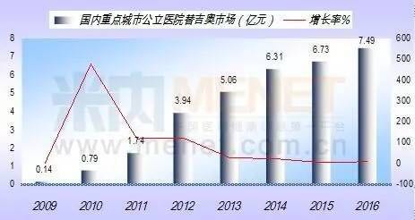 据HDM系统数据显示,2016年国内重点城市公立医院替吉奥用药金额7.49亿元,同比上一年增长了11.27%;其中胶囊剂占据了99.96%,片剂为0.04%;国内等级医院替吉奥总体市场已达到26.65亿元规模。