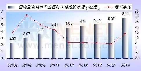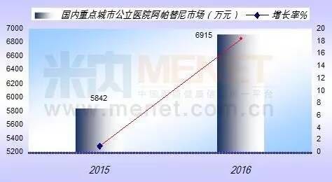 据HDM系统数据显示,2016年国内重点城市公立医院胃癌靶向药物阿帕替尼达到了6915万元,同比上一年增长了18.37%,取得良好的开端。