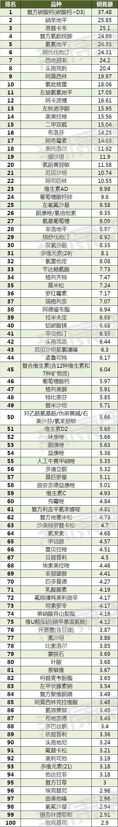 2016年国内零售终端西药销售额TOP100品种(单位:亿元)