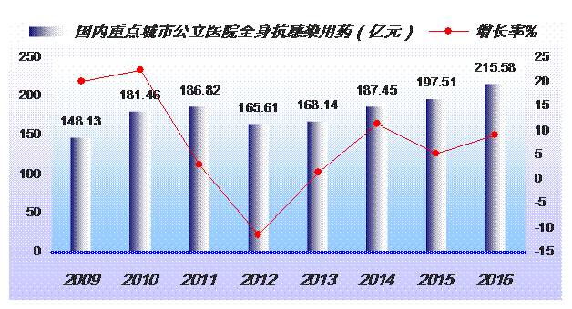 2016年国内重点城市公立样本医院全身抗感染用药市场达215.58亿元,同比上年增长了9.15%。其中不同的药物表现各异,国内三大终端6大市场的规模超过2000亿元。而多个品种表现出“你方唱罢我登场”的竞争局面。