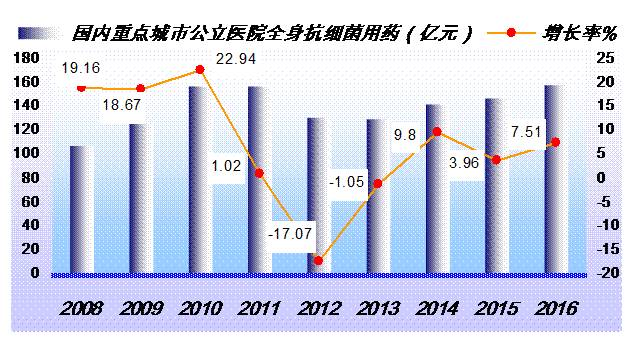 最新数据显示,2016年国内重点城市样本公立医院全身用抗细菌药用药金额为159.38亿元,同比上年增长率为7.51%。最关键的一点是优化了用药结构,提高用药水平,遏制细菌耐药性,保障患者用药安全的目标。而城市公立医院、县级公立医院、城市社区中心、乡镇卫生院、实体药店、网上药店三大终端6大市场头孢菌素销售额为1154.30亿元,同比上一年增长率仅为2.26%。国内限抗全面落实。