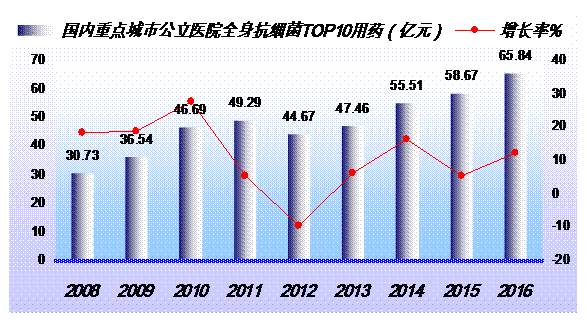 我国近年来开展了抗菌药物临床应用专项整治活动,自2011年正式实施《抗菌药物临床应用管理办法》(卫计委84号令)后,以抗生素安全性、有效性、细菌耐药情况和价格因素为基本原则,将抗生素分为非限制使用、限制使用与特殊使用三级管理原则。迄今为止,国家卫计委下达了围绕医改为中心、限抗为先导的共15个指导性文件,打响了一场抗生素临床应用专项整治的持久战。高速增长的抗生素市场急刹车,导入了良性发展轨迹,国内重点城市公立医院用药市场的数据变化,充分证明了近年来抗生素市场的运行轨迹。