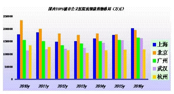 2016年国内重点城市公立样本医院全身用抗细菌药品购药金额呈现出差异性发展,各城市增长率也不一样,以前五位城市为例,北京多年稳居抗生素的冠军宝座,限抗行动后,2016年北京公立医院抗生素用药降到第二位。具体的增长率情况分别是上海14.19%、北京9.42%、广州5.69%、武汉5.68%、杭州1.14%,增长系数是受多个复杂因素影响,与就诊人群结构、用药习惯、消费水平环环相扣。