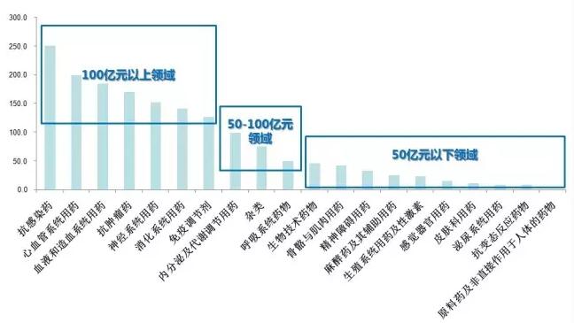 2016年国内样本医院用药金额排名前十大领域是:抗感染药销售额为251.0亿元,较同期增长7.9%;心血管系统用药销售额为199.7亿元,较同期增长4.7%;血液和造血系统用药销售额为185.1亿元,较同期增长9.5%;抗肿瘤药销售额为169.8亿元,较同期增长11.2%;神经系统用药销售额为151.7亿元,较同期增长9.7%;消化系统用药销售额为141.4亿元,较同期增长8.2%;免疫调节剂销售额为126.5亿元,较同期增长7.5%;内分泌及代谢调节用药销售额为98.6亿元,较同期增长9.1%;杂类销售额为75.6亿元,较同期增长12.6%;呼吸系统药物销售额为50.0亿元,较同期增长12.5%。前十大领域占据整体市场87.2%,增长较快的领域有抗肿瘤药和呼吸系统药物,增长率均超过10.0%。
