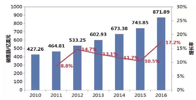 2016年,抗体药市场规模达到870亿美元,五年复合增长率达到12.6%。