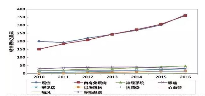 各治疗领域抗体药销售额变化:癌症、自身免疫病依然最“重”