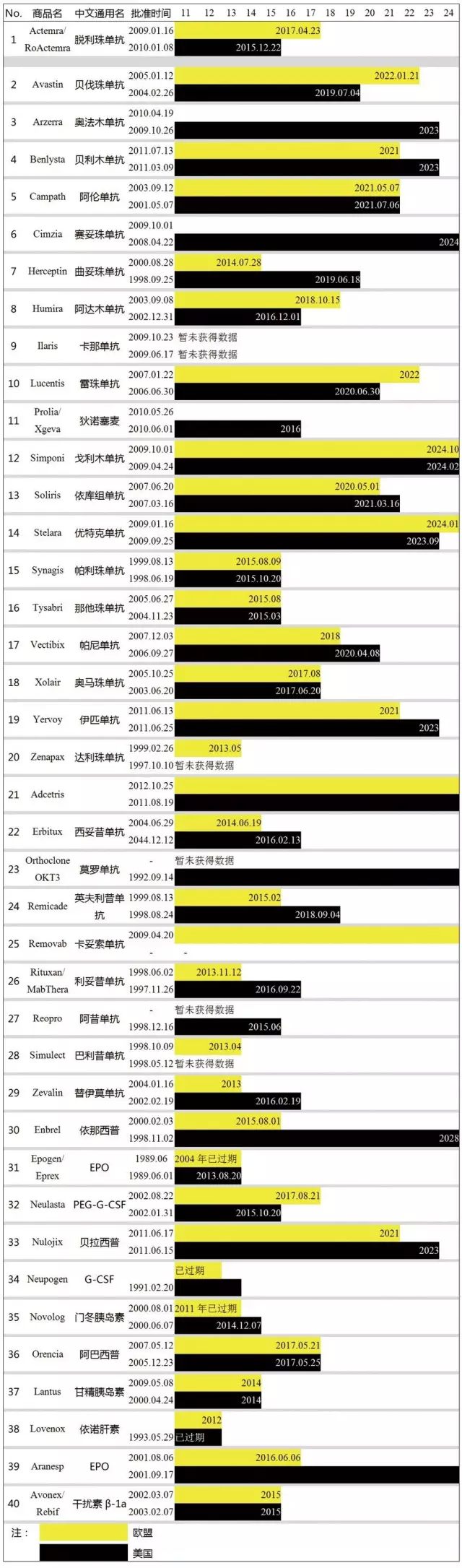 笔者梳理40个近年专利将陆续到期的主要重磅生物药,这些生物药也是目前生物类似药开发的主要目标。