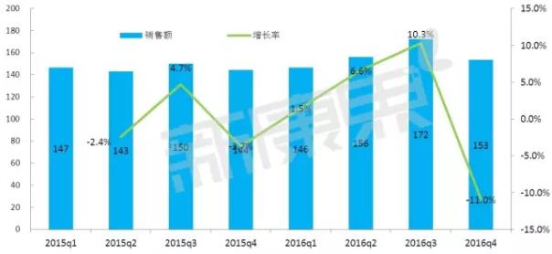 图1 2015年1季度-2016年4季度浙江等级医院药品销售规模(亿元)和增长情况