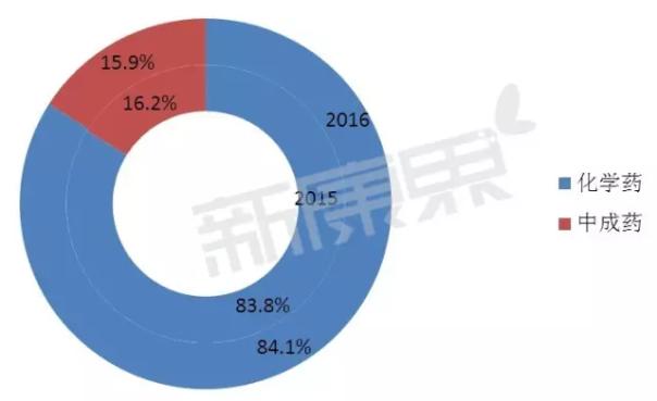 图2 2015-2016年浙江等级医院化学药/中成药市场份额