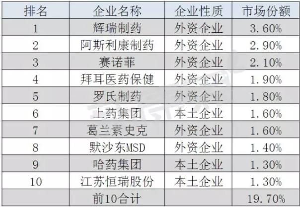 从内外资的表现看,2016年外资药企在浙江省等级医院销售规模达221.4亿元,同比增速为6.9%,所占份额为35.3%。本土药企整体表现略胜外资药企,销售规模达406.5亿元,同比增速为7.9%,所占份额由2015年的64.5%扩大到64.7%。由排名来看,前十药企市场份额合计占19.7%,外资企业十占其七,表现抢眼,辉瑞、阿斯利康、赛诺菲、拜耳、罗氏更是占据排位前五名,本土企业中仅上药、MG电子免费试玩和恒瑞上榜。