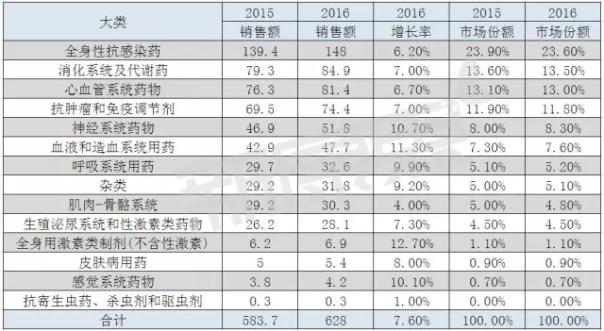 全身性抗感染药是浙江等级医院药品销售最大的一个类别,2016年市场占比达23.56%,规模达148亿元,是唯一超过100亿元的类别。消化系统及代谢药、心血管系统药物、抗肿瘤和免疫调节剂市场占比均超过10%,分别排名2~4位,与2015年保持一致。