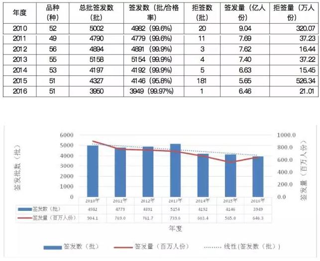 通过分析 2010 年至 2016 年疫苗批签发数据,反映出:一是疫苗品种稳定。历年疫苗品种数基本持平,在 50 种左右。二是批签发批次呈下降趋势。2010 至 2013 年每年 5000 批左右,近三年每年 4000 批左右。与 2015 年比较,2016 年虽总批次略有下降,但总体签发量并未减少,约计 6.46 亿人份。