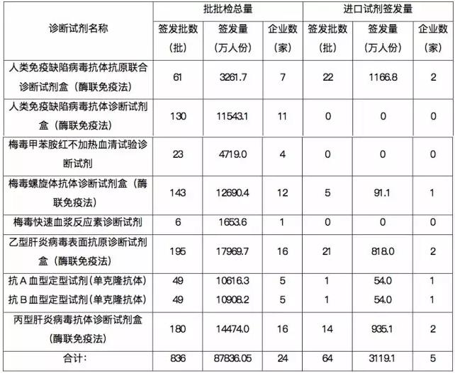 根据《药品管理法》和《药品管理法实施条例》,血源筛查用体外诊断试剂按照生物制品管理,并且实施批签发,每批制品在上市前均需经过中检院的批批检。经过多年对生产企业的严格规范和监管,近年来生产企业整体稳定,血源筛查用体外诊断试剂质量较好,连续 5 年批批检合格率达 100%。2016 年中检院共签发血源筛查用体外诊断试剂 836 批约 计 8.78 亿人份,涉及 9 个品种,24 家生产企业。其中,进口制品 64 批(占总签发批数的 8%)约计 0.3 亿人份(占总签发人份数的 3.5%),涉及 6 个品种,5 家进口生产企业。与 2015 年比较,两年各品种签发批次差别不大。
