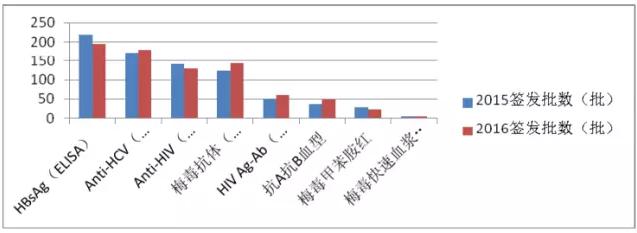 2015 年与 2016 年血源筛查用体外诊断试剂签发批次比较