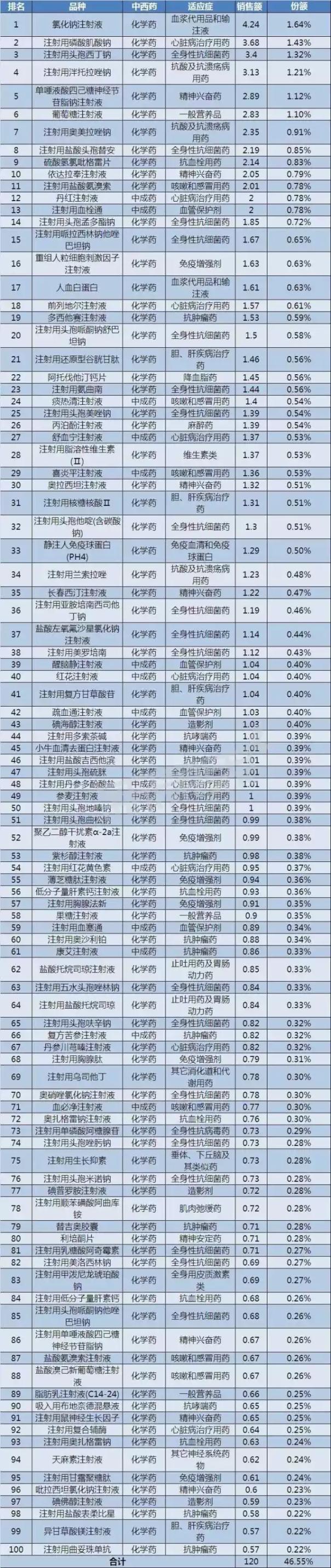 TOP10品种均为化学药,其中有2个全身性抗细菌品种,分别是排名第3的注射用头孢西丁钠和排名第8的注射用盐酸头孢替安,合计销售额5.60亿元,份额占总体市场2.17%。氯化钠注射液以销售额4.24亿元,市场份额1.64%排名首位,中成药排名最高的是丹红注射液(2.00亿元,0.78%,第12名)。