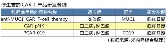 博生吉作为先行的国内免疫细胞疗法开发公司,主要业务为开发细胞治疗技术(CAR-T、CAR-NK、aAPCCTL和aAPCNK技术)和抗体靶向药物。2015年6月,安科生物出资2000万元与博生吉强强联手,成立合资公司,专攻CAR-T细胞治疗技术研究及产业化运作。博生吉目前已经有3个CAR-T项目处于临床Ⅱ期,其中包含了较难治愈的多种实体瘤,研发进度在国内处于领先位置。