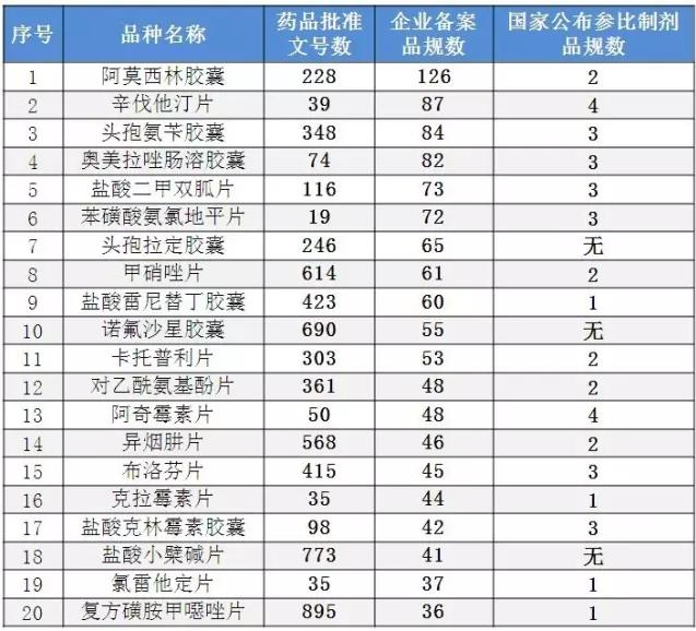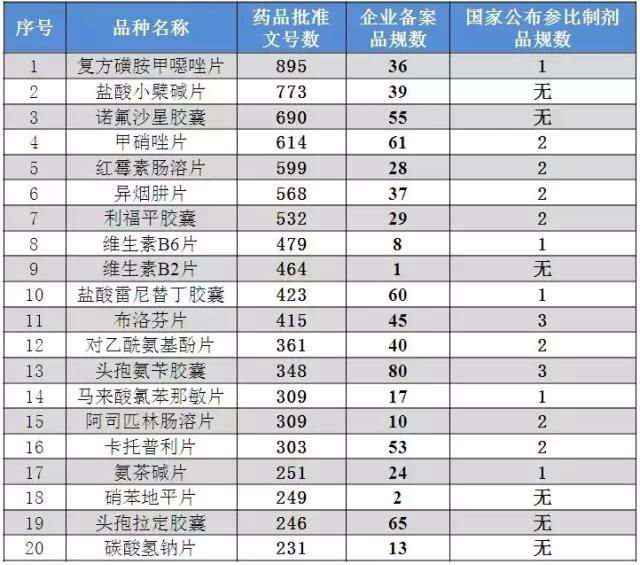 企业备案品规数前20产品除了头孢拉定胶囊、诺氟沙星胶囊和盐酸小檗碱片外,国家都已公布了相关参比制剂。