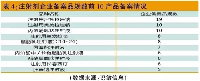 目前已备案169个注射剂企业品规,其中注射用泮托拉唑钠备案数最多。海南普利制药股份有限公司注射用泮托拉唑钠曾以“同步递交欧盟注册申请,已通过欧盟GMP检查”为由申报优先审评并已被批准。如表4所示,注射剂备案品规数较多者,以质子泵抑制剂和麻醉药为主。