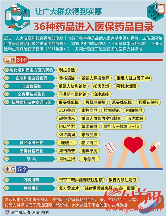 徐延君说,医保药品目录准入谈判是国际上常见的做法,前期地方也有一些探索。谈判成功的36个药品中包括了31个西药和5个中成药。31个西药中15个是肿瘤治疗药,涉及肺癌、胃癌、乳腺癌、结直肠癌、淋巴瘤、骨髓瘤等常见癌种。其他的药品分别是肾病、眼科、精神病、抗感染、糖尿病以及罕见病用药。包括了此前参保人员反映比较多的雷珠单抗、曲妥珠单抗、利妥昔单抗、硼替佐米、来那度胺等。
