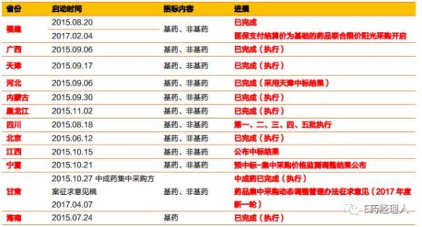 根据天风证券研报显示,截至2017年7月中旬,浙江、安徽、湖南、福建、广西、天津、河北、内蒙古、黑龙江、四川、北京等11省市已率先完成新一轮的省级药品集中公开招标采购。包括江西、宁夏、甘肃等在内的11省市处于即将完成或者部分完成集中招标任务的状态,而贵州、江苏等7省市则尚在推进之中。