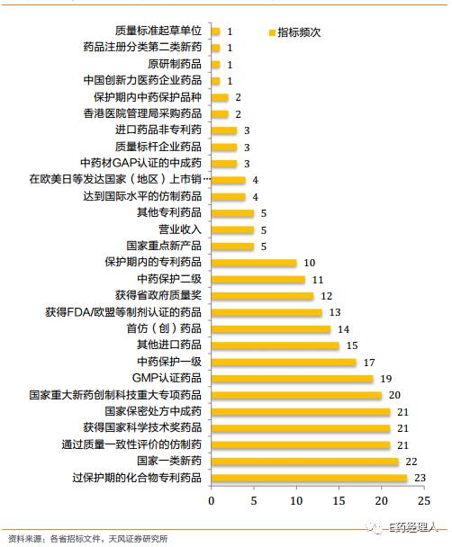 至于具体的质量分层评价指标,整体上参差不齐,总数已经达到近30个,但明显的一个趋势是,质量等指标重视程度提高。举例来说,“国家一类新药”、“通过仿制药质量一致性评价的药品”、“GMP认证药品”等都属于出现频次较高的表达,而以往频率较高的“创新企业药品”、“企业规模”、“质量标准起草单位”、企业营业收入排名等企业信息相关指标等在新一轮招标中出现频次则较低。