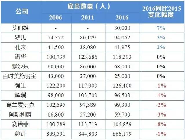 最后一家扩员的企业是礼来(Eli Lilly),2016年其员工数增加了2%,达到41975人。事实上,最近几年因专利悬崖,该公司进行了数千人规模的裁员,如今,员工人数重返涨势,2016年礼来的员工规模刚刚超过2006年的水平。
